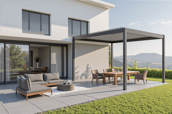 The Starry Pergola GR-9100A showcases a semi-permanent design that incorporates single-layer, innovative louvres. This feature allows users to customize their outdoor experience by easily adjusting the shade. With a maximum 90-degree crank-operated louvre system, users can effortlessly open or close the louvres to suit their preferences. As an established aluminum pergola factory, Greenawn has ensured that this model meets high standards of durability and function. The pergola is 100% waterproof and equipped with an internal gutter system, making it practical for various weather conditions.
